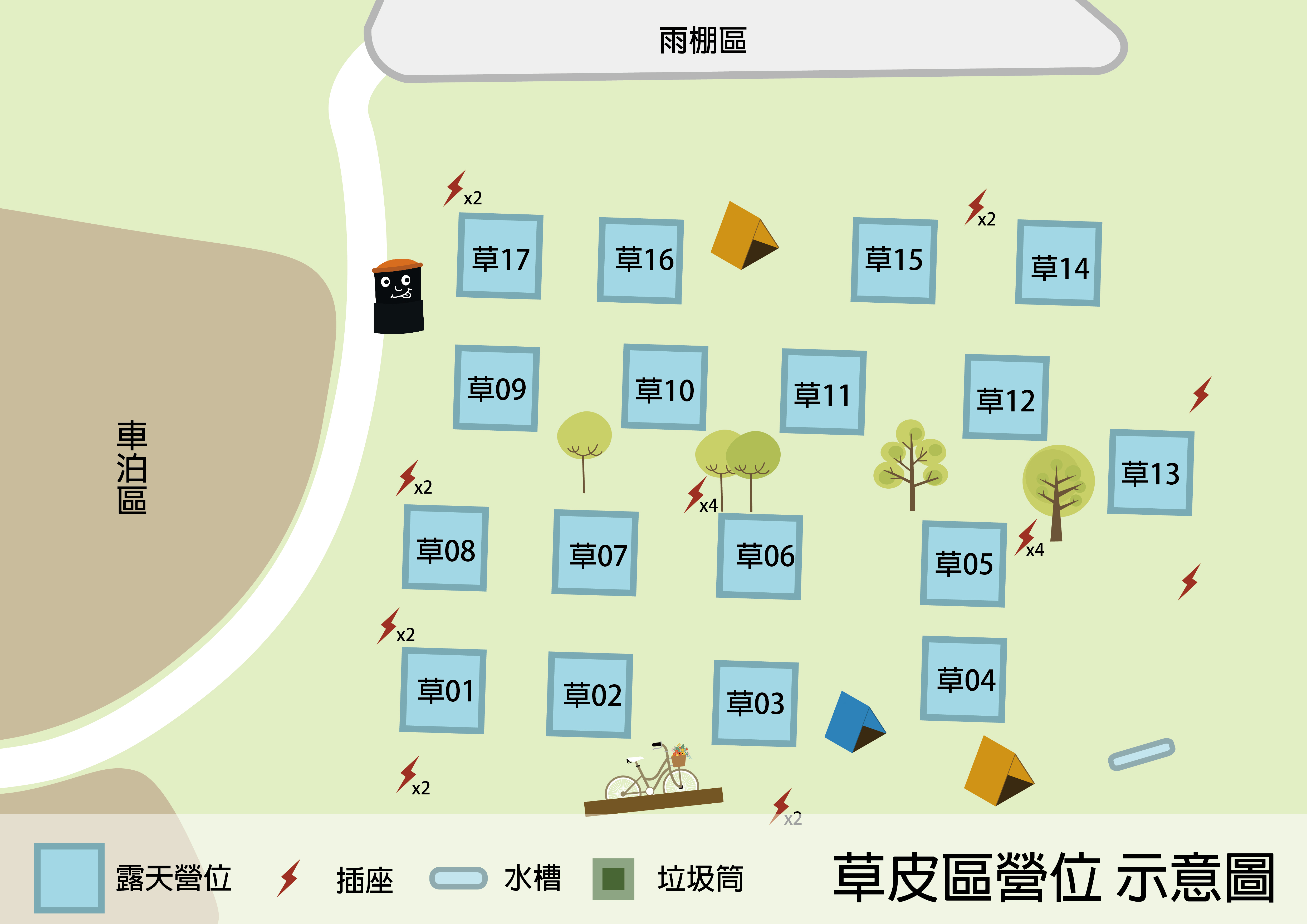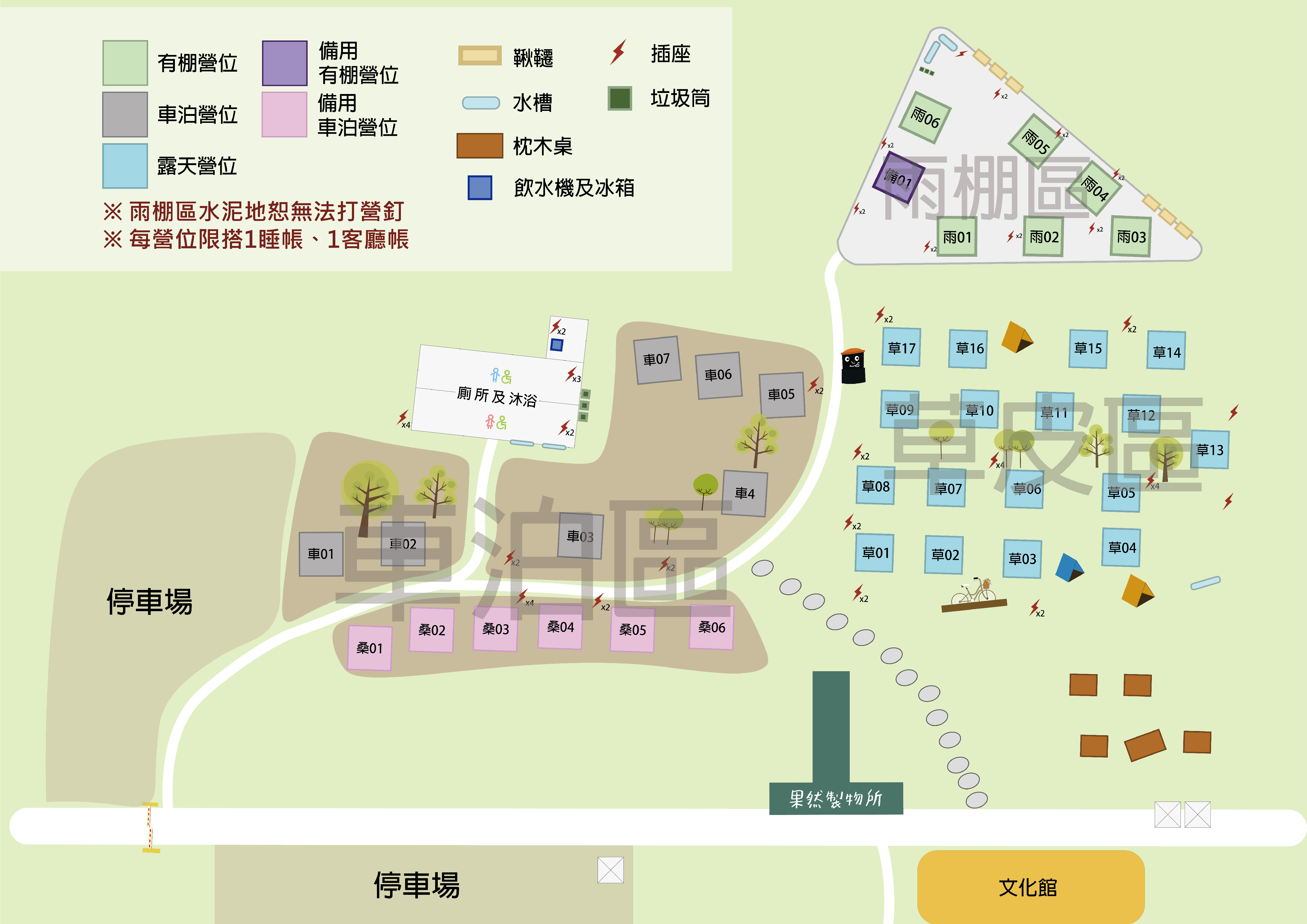 園區僅提供場地、冰箱、飲水機、插座(每營位1電源插座)及衛浴(衛浴用熱水24小時提供,請節約用水);