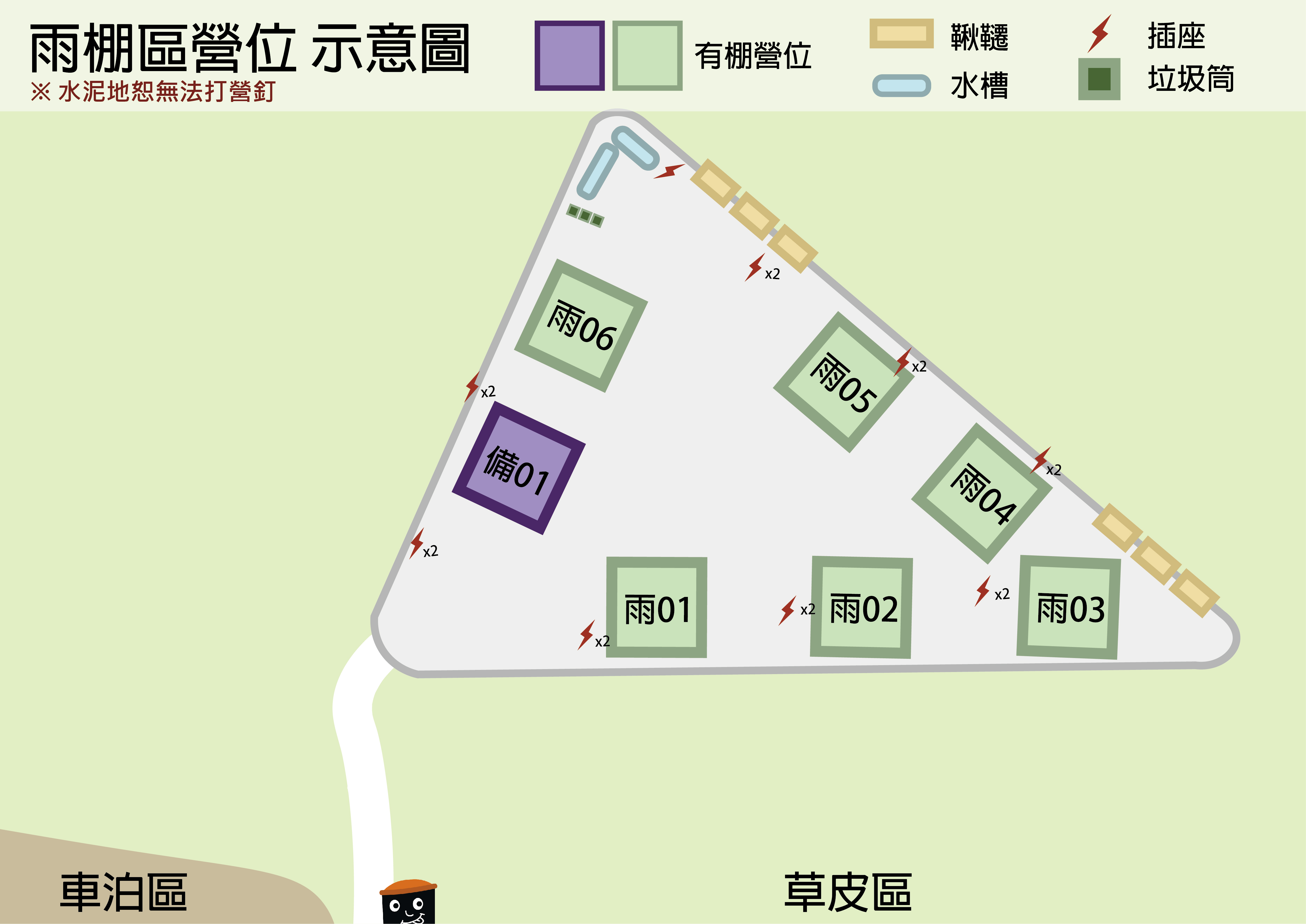 2. 遮雨棚為水泥營位,嚴禁使用營釘
